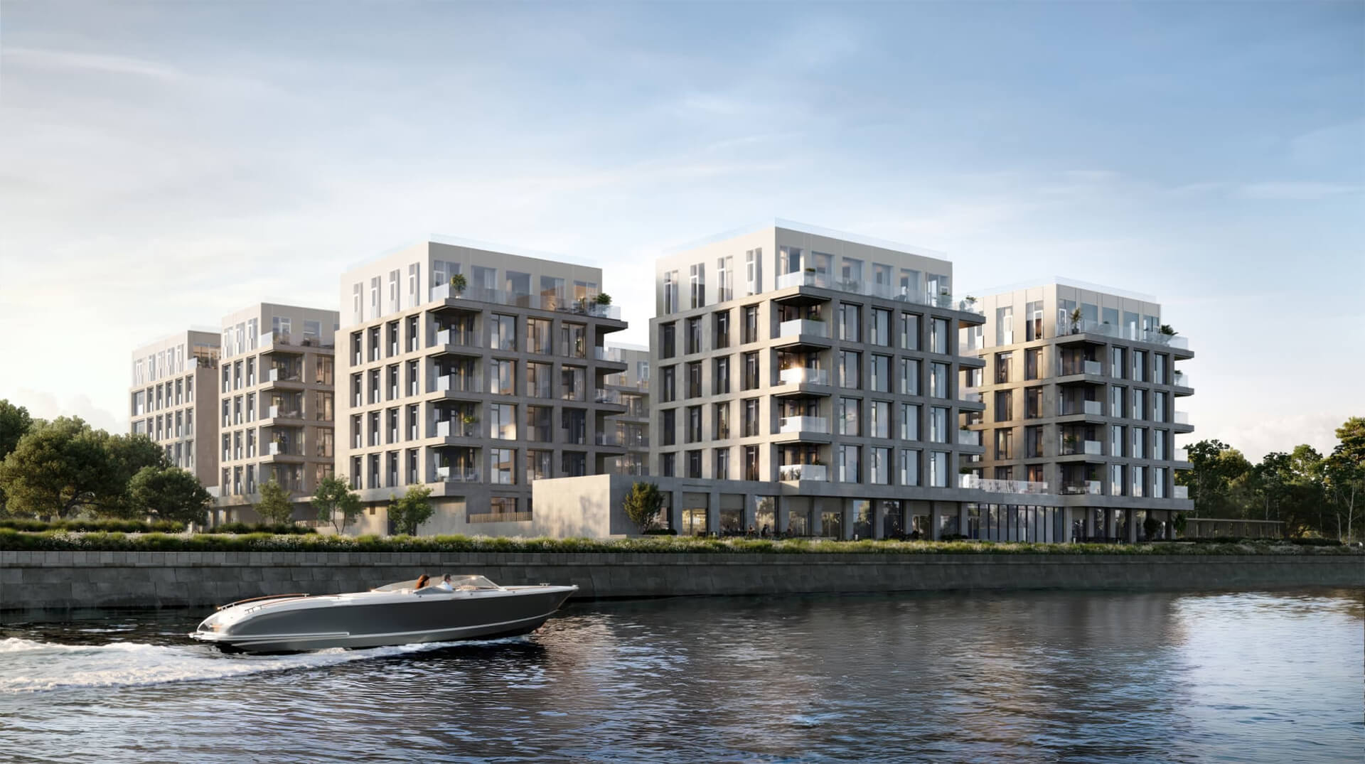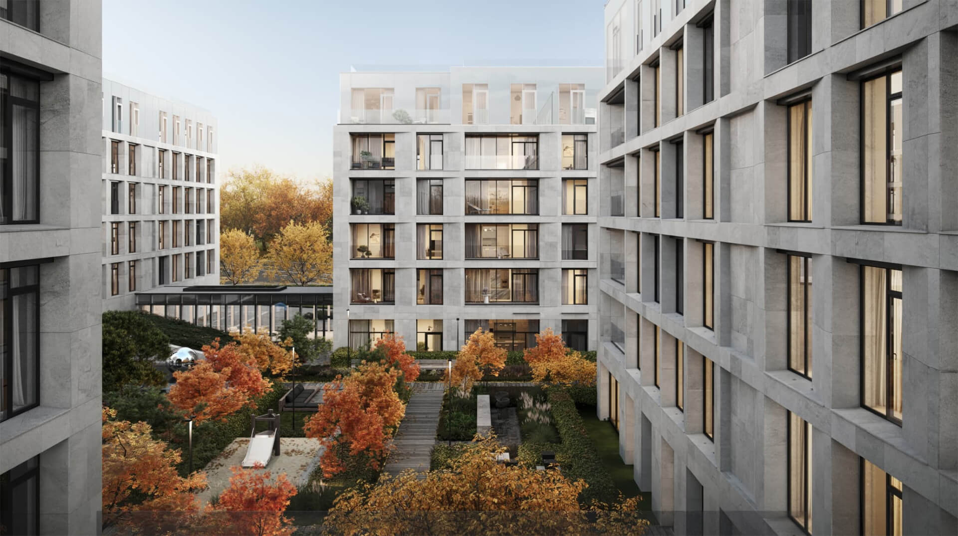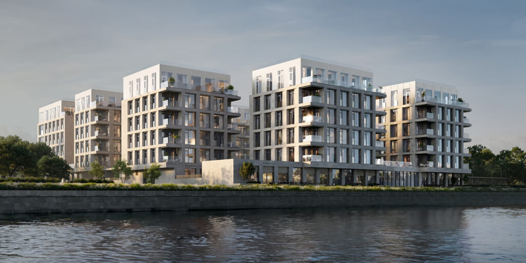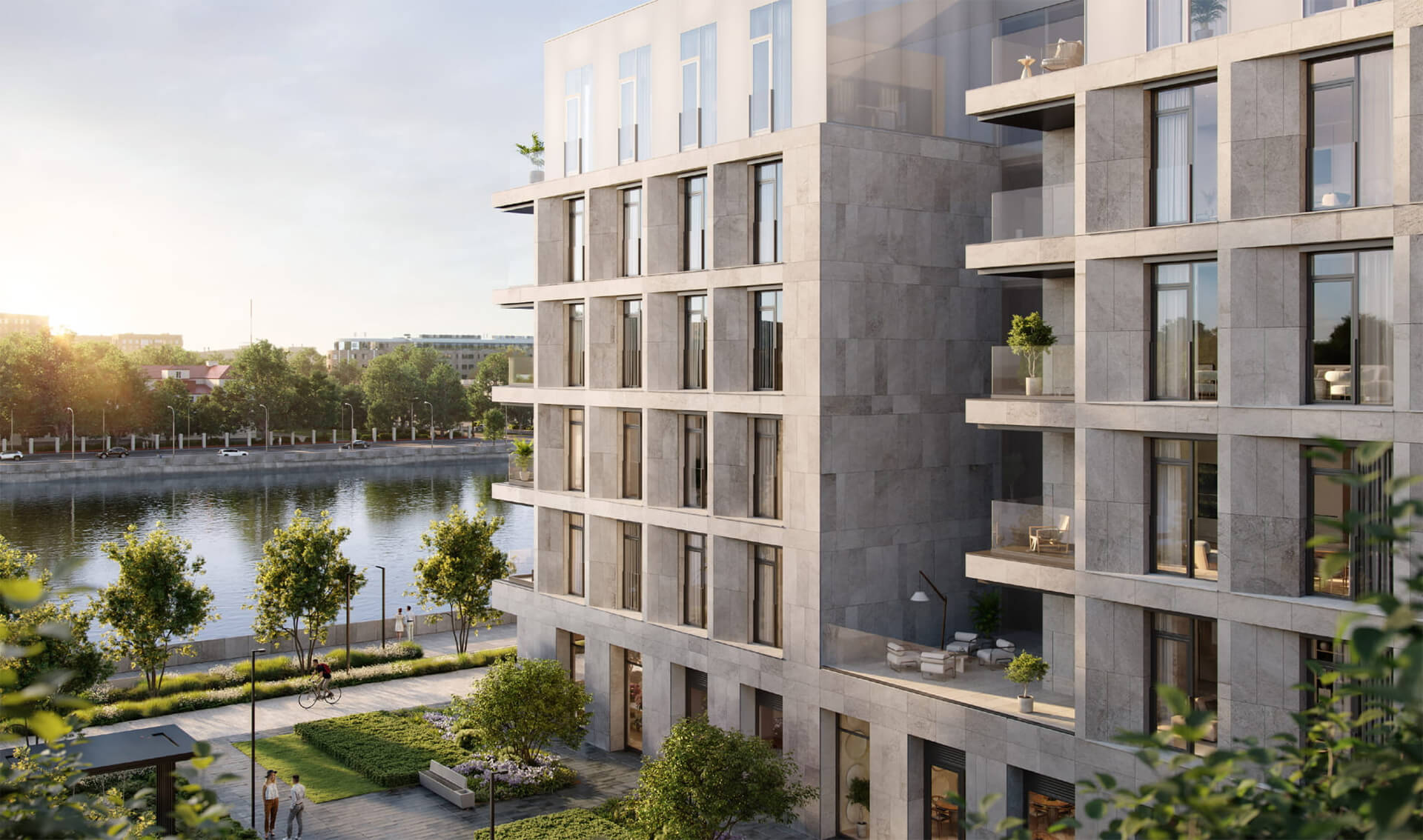 Малоэтажные корпуса комплекса органично сливаются с ландшафтом набережной Москвы-реки. Панорамные окна пропускают максимум света и воздуха, открывая виды на речные пейзажи. Открытые лоджии на углах зданий и просторные террасы пентхаусов с прозрачными ограждениями из закалённого стекла придают фасадам выразительность и современный стиль.