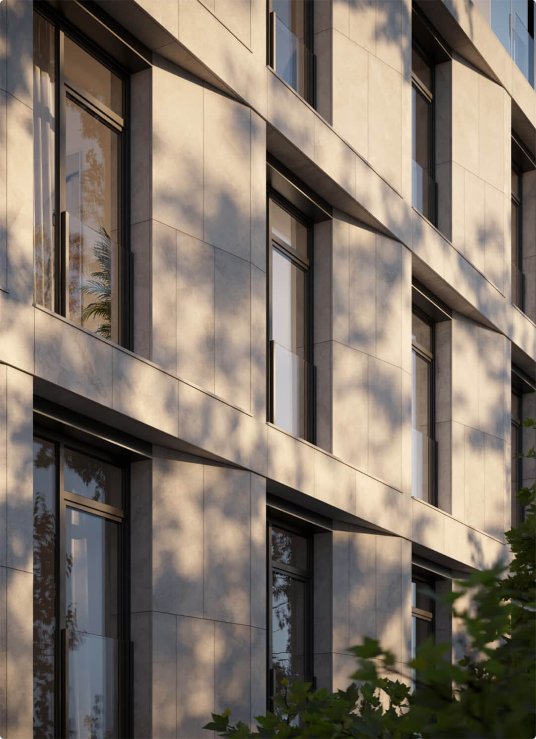 Основным материалом для облицовки фасадов выбран натуральный светлый камень с выразительным рисунком, что придаёт зданиям элегантность и гармонично вписывает их в природный контекст. Наружные технические двери также будут выполнены из металла и отделаны в тон фасада, а для покрытия террас на втором и шестом этажах используется доломит геналдон.